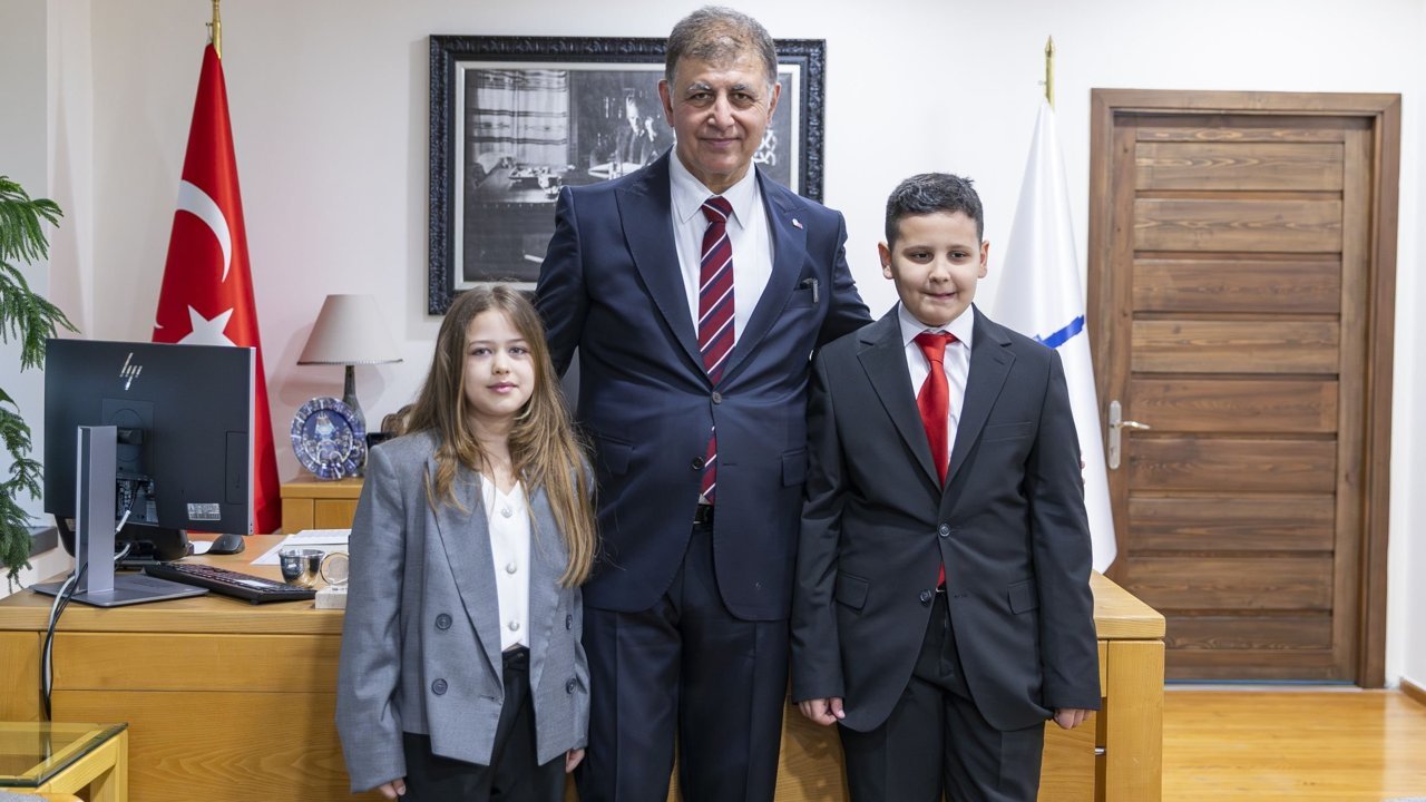 İzmir Büyükşehir Belediye Başkanı Dr. Cemil Tugay, 23 Nisan Ulusal Egemenlik ve Çocuk Bayramı’nda koltuğunu 5. sınıf öğrencisi ve İzmir Çocuk Meclisi üyesi Meryem Günay ile 4. sınıf öğrencisi Aras...